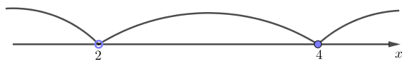 Найдем нули функции \(\displaystyle f(x)=(x-2)(x-4){\small : } \)