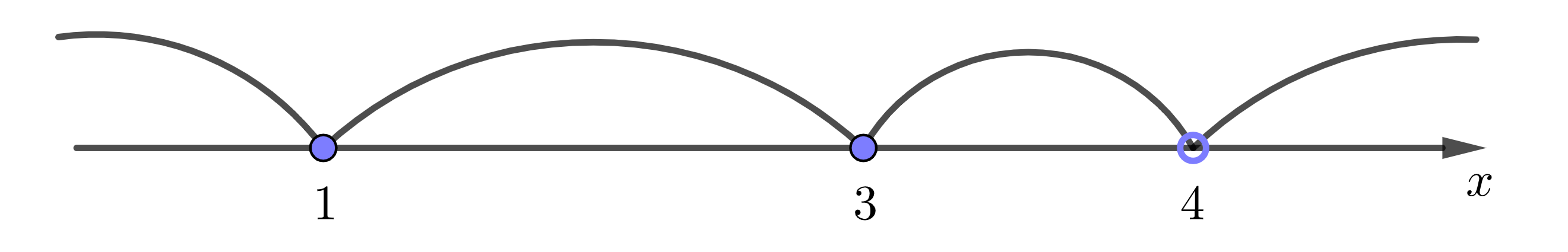 Так как \(\displaystyle x=1\) и \(\displaystyle x=3 \) обращают в ноль числитель и не обращают в ноль знаменатель, то они обозначаются закрашенными. Поскольку \(\displaystyle x=4 \) обращает в ноль знаменатель, то она обозначается выколотой: