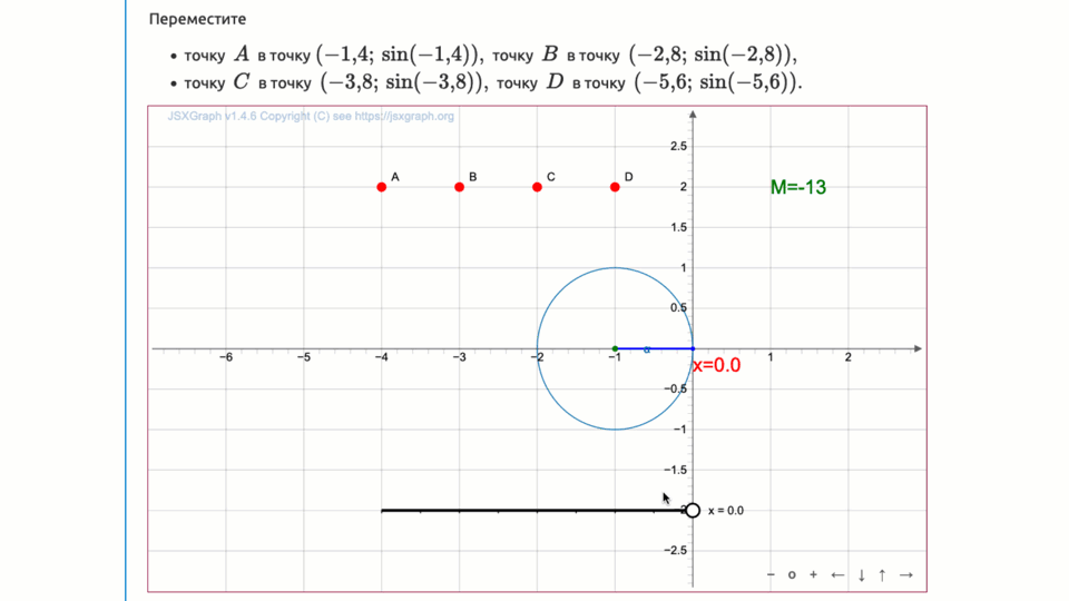 - точку \(\displaystyle A\) в точку\(\displaystyle (-1{,}4;\, \sin(-1{,}4)){\small ,}\) точку \(\displaystyle B\) в точку \(\displaystyle (-2{,}8;\, \sin(-2{,}8)){\small ,}\)