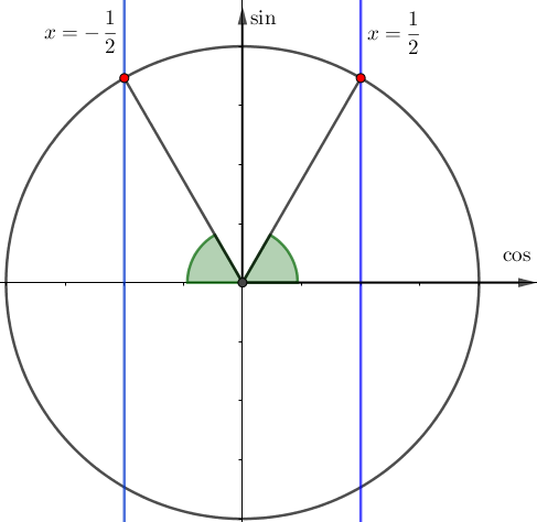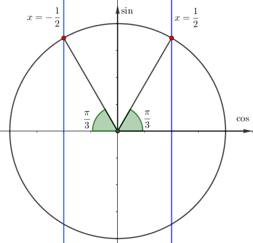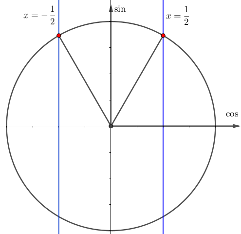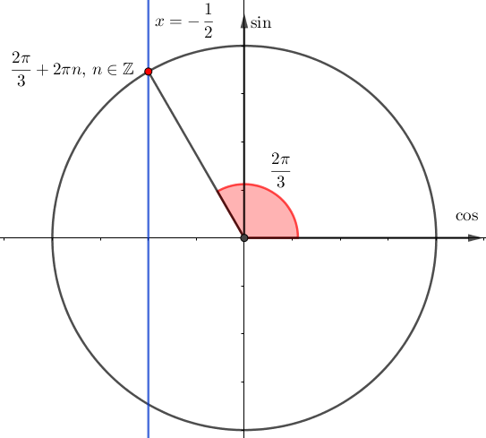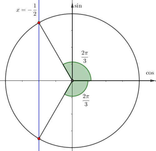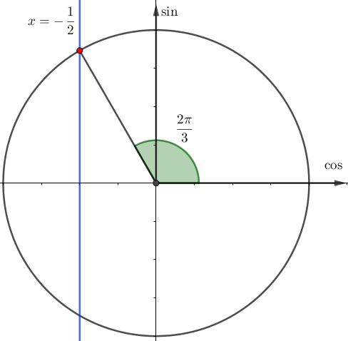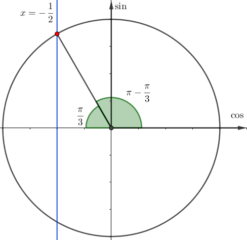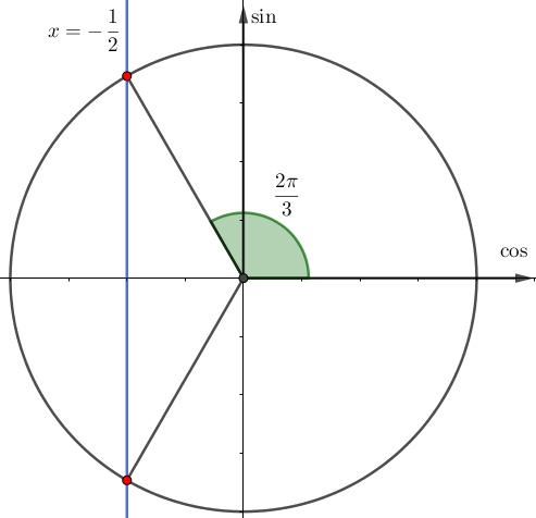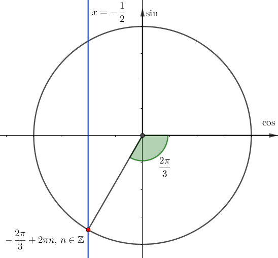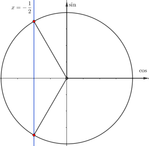 Так как значения косинуса лежат на оси \(\displaystyle \rm OX{ \small ,}\) то пересечем прямую \(\displaystyle x=-\frac{1}{2}\) и тригонометрическую окружность: