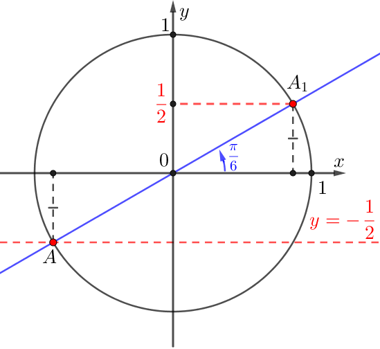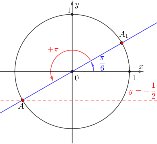 Так как значения синуса лежат на оси \(\displaystyle \rm OY{ \small ,}\) то пересечем прямую \(\displaystyle y=-\frac{1}{2}\) и тригонометрическую окружность: