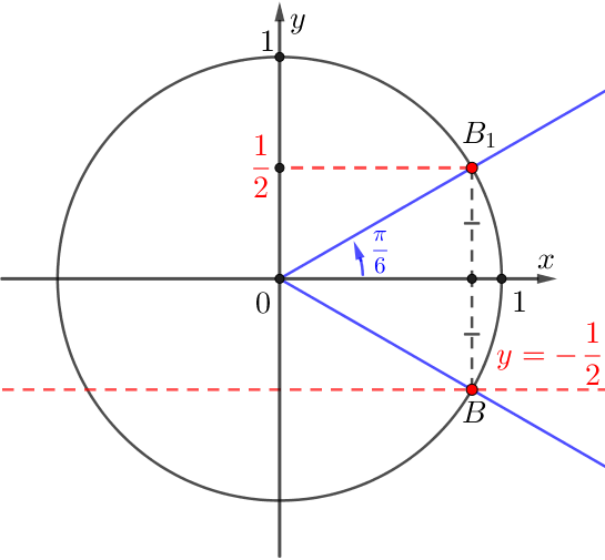 Точка \(\displaystyle B\) симметрична относительно оси \(\displaystyle \rm OX\) точке \(\displaystyle B_1{\small,}\) соответствующей повороту на \(\displaystyle \frac{\pi}{6}{\small:}\)