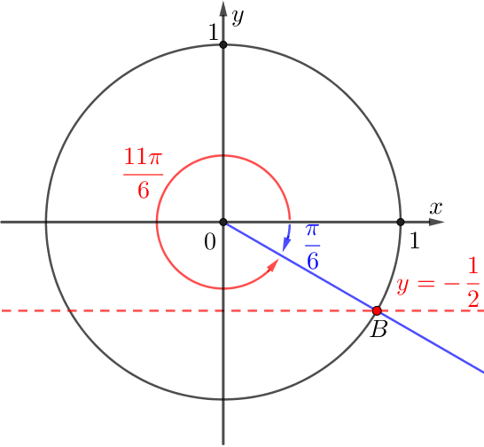 Значит, угол поворота луча \(\displaystyle OB\) равен \(\displaystyle -\frac{\pi}{6}\) или \(\displaystyle 2\pi-\frac{\pi}{6}=\frac{11\pi}{6}{\small:}\)
