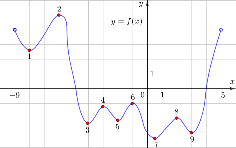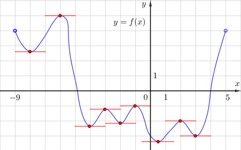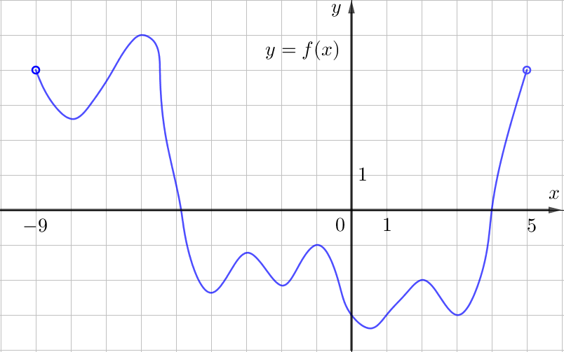 На рисунке изображён график функции \(\displaystyle y = f(x){ \small ,}\) определённой на интервале \(\displaystyle (-9; 5){\small .}\)Найдите количество точек, в которых производная функции \(\displaystyle f(x)\)равна \(\displaystyle 0{\small .}\)