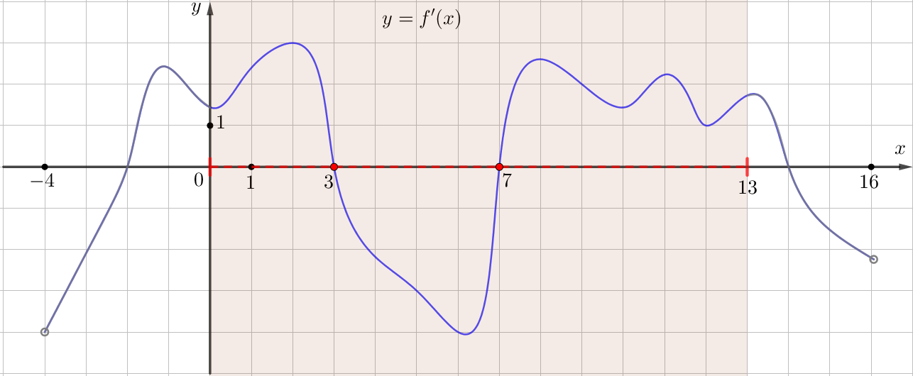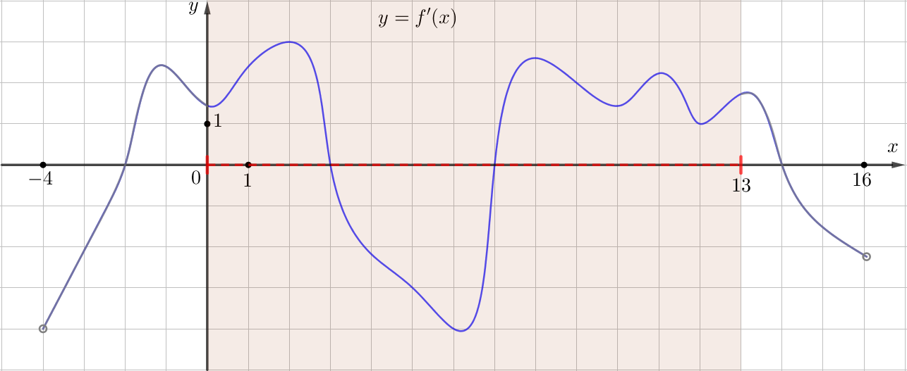 Поэтому далее будем рассматривать график \(\displaystyle y=f^{\prime}(x)\) только на отрезке \(\displaystyle [0;\, 13 ]{\small:}\)