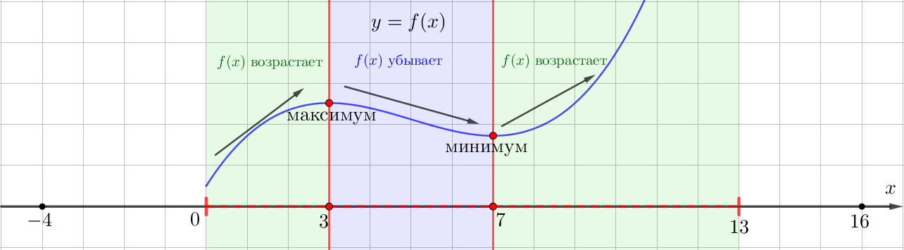 \(\displaystyle (0;\,3){\small,}\) \(\displaystyle (7;\,13)\)\(\displaystyle \color{green}{f^{\prime}(x)>0}\)\(\displaystyle f(x)\) возрастает \(\displaystyle \color{green}{\nearrow}\)