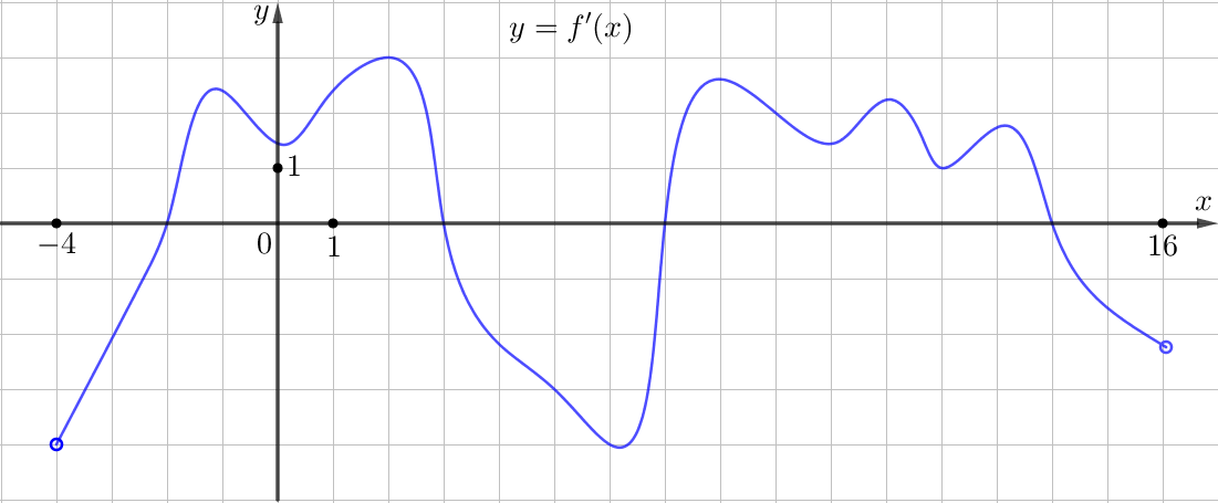 На рисунке изображен график производной функции \(\displaystyle y = f(x){ \small ,}\) определенной на интервале \(\displaystyle (-4; 16){\small .}\) Найдите количество точек максимума функции \(\displaystyle f(x)\) на отрезке \(\displaystyle [0; 13]{\small .}\)