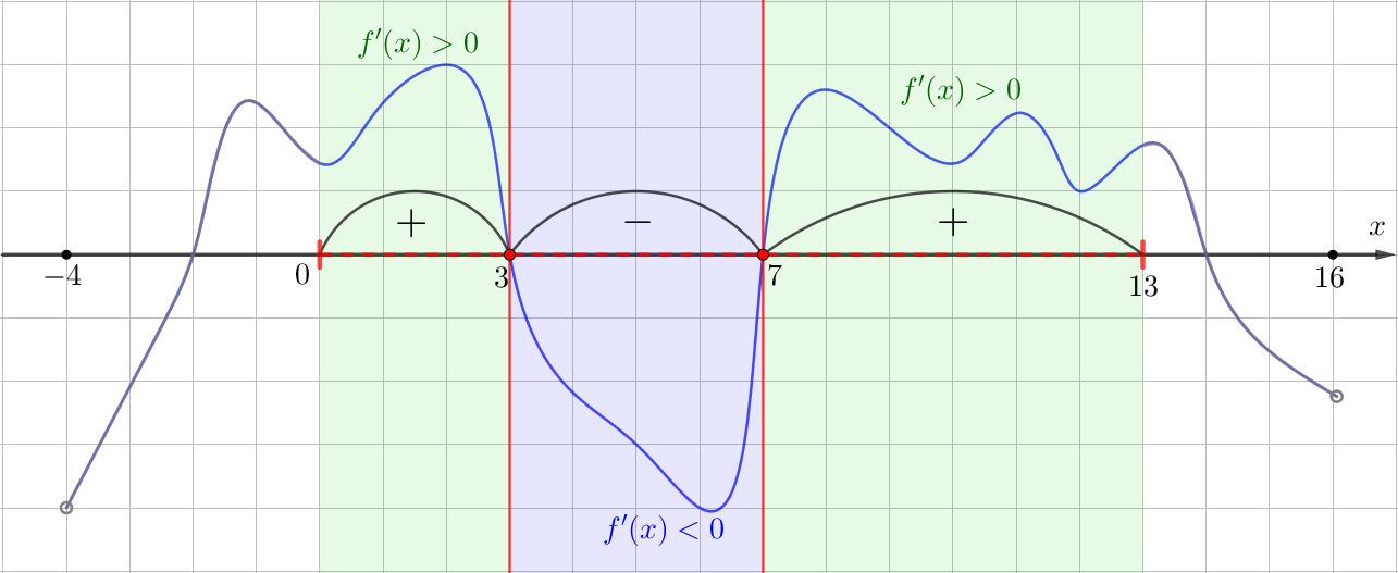 На интервалах \(\displaystyle (0;\,3)\) и \(\displaystyle (7;\,13)\) производная положительна, на интервале \(\displaystyle (3;\, 7)\) производная отрицательна.