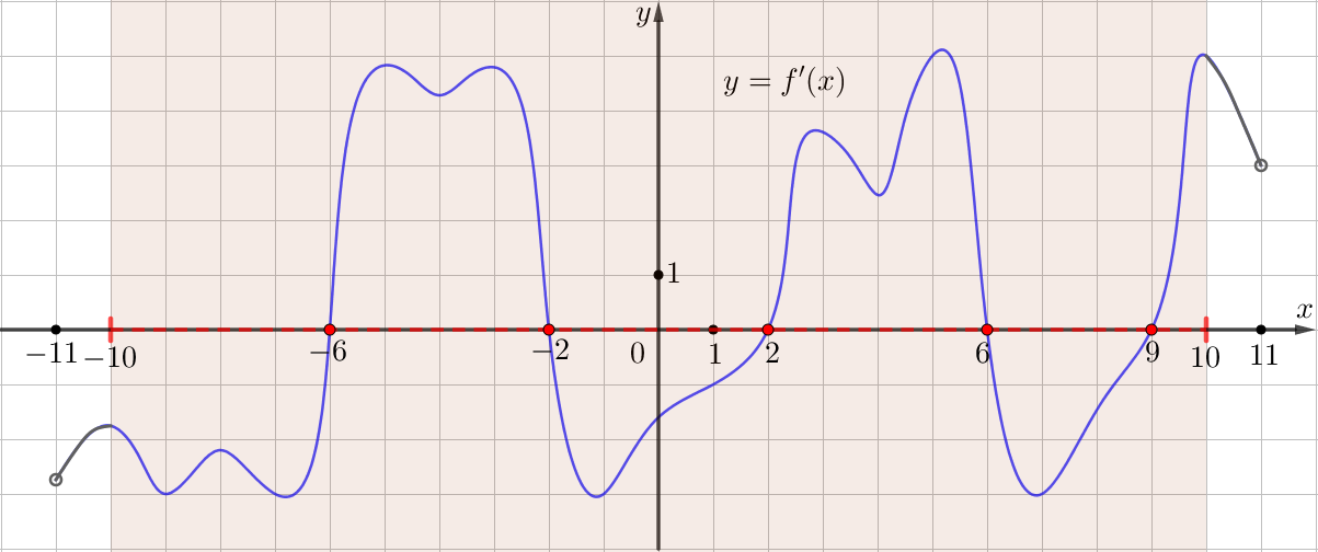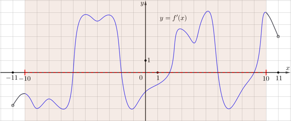 Поэтому далее будем рассматривать график \(\displaystyle y=f^{\prime}(x)\) только на отрезке \(\displaystyle [-10;\, 10 ]{\small:}\)