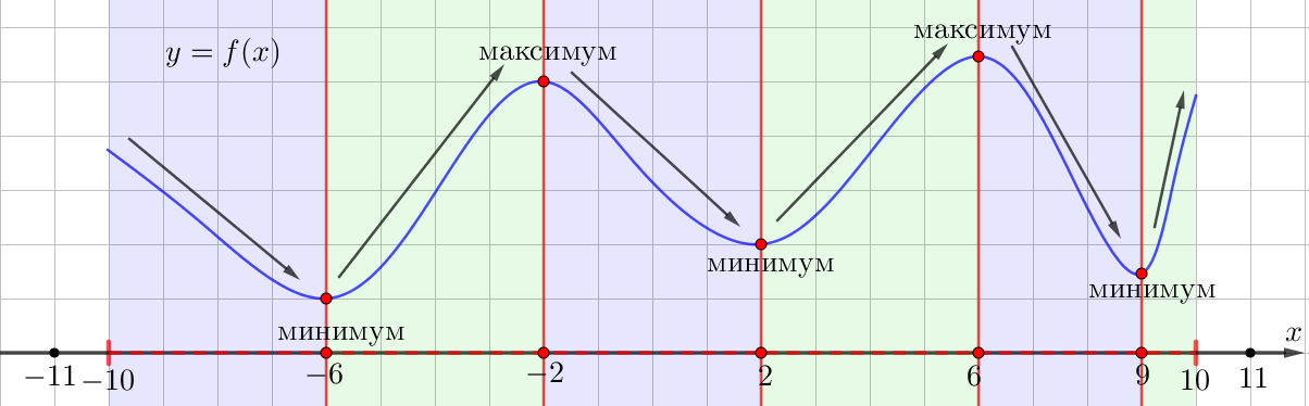 | \(\displaystyle (-6;\,-2){\small,}\) \(\displaystyle (2;\,6){\small,}\) \(\displaystyle (9;\,10)\) | \(\displaystyle \color{green}{f^{\prime}(x)>0}\) | \(\displaystyle f(x)\) возрастает \(\displaystyle \color{green}{\nearrow}\) |