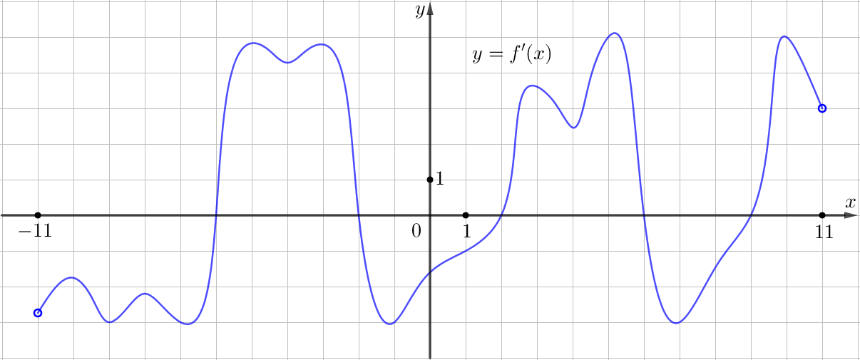На рисунке изображен график производной функции \(\displaystyle y = f(x){ \small ,}\) определенной на интервале \(\displaystyle (-11; 11){\small .}\) Найдите количество точек экстремума функции \(\displaystyle f(x)\) на отрезке \(\displaystyle [-10; 10]{\small .}\)