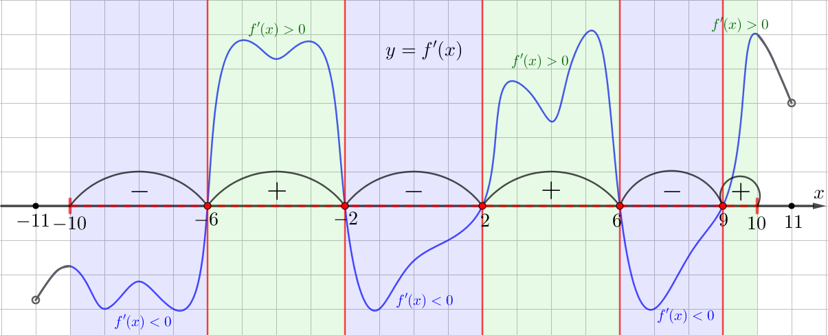 На интервалах \(\displaystyle (-10;\,-6){\small,}\) \(\displaystyle (-2;\,2){\small,}\) \(\displaystyle (6;\,9)\) производная отрицательна, на интервалах \(\displaystyle (-6;\,-2){\small,}\) \(\displaystyle (2;\,6){\small,}\) \(\displaystyle (9;\,10)\) положительна.