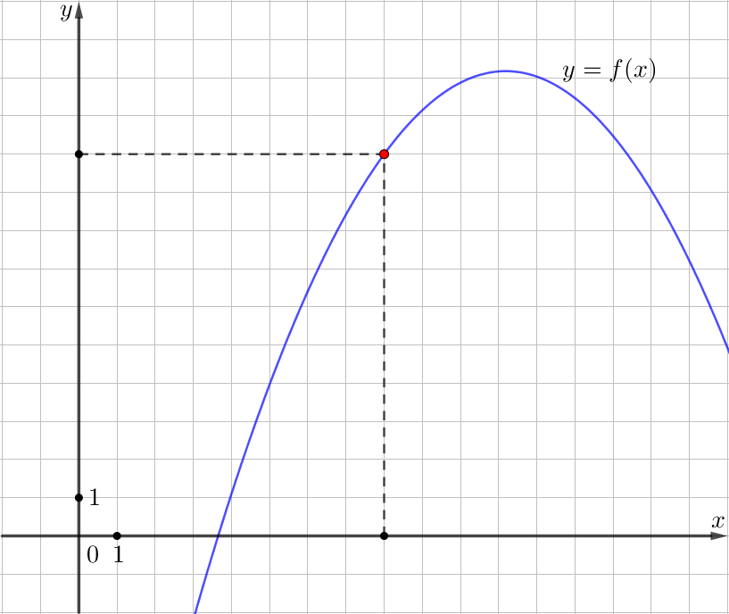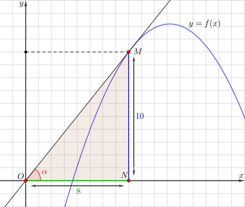 Касательная, ось абсцисс и вертикальная прямая, проходящая через точку касания графика, образуют прямоугольный треугольник. Назовем его вершины \(\displaystyle M{\small,}\) \(\displaystyle N{\small,}\) \(\displaystyle O\small.\) Найдем длину катетов: \(\displaystyle \color{blue}{MN}=\color{blue}{10}\) и \(\displaystyle \color{#009900}{NO}=\color{#009900}{8}{\small.}\) Тангенс угла \(\displaystyle \color{red}{\alpha}\) равен отношению противолежащего катета к прилежащему: \(\displaystyle \tg \color{red}{\alpha}=\frac{\color{blue}{MN}}{\color{#009900}{NO}}=\frac{\color{blue}{10}}{\color{#009900}{8}}=1{,}25{\small.}\) |