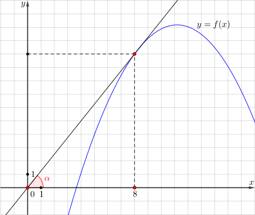 Значение производной в точке \(\displaystyle x_0\) равно \(\displaystyle \tg({\alpha}){ \small ,}\) где \(\displaystyle {\alpha}\) – угол наклона касательной в соответствующей точке на кривой \(\displaystyle y=f(x){\small .}\) Проведем касательную через точку графика с абсциссой \(\displaystyle 8{\small.}\) По условию она проходит через точку начала координат. Получаем, что \(\displaystyle f^{\prime}(8)=\tg \color{red}{\alpha}{\small.}\) |