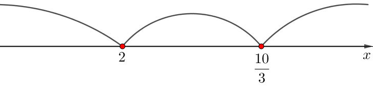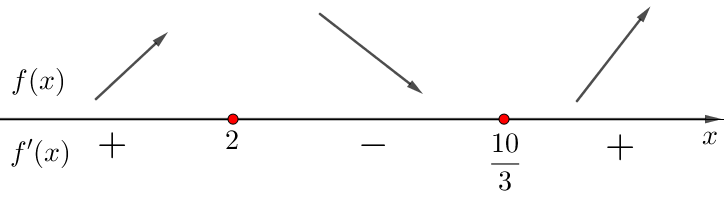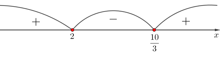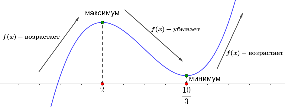 - на интервалах \(\displaystyle \color{green}{(-\infty;\,2)}\) и \(\displaystyle \textcolor{Purple}{\left(\frac{10}{3};\, +\infty\right)}\) функция \(\displaystyle f^{\prime}(x)>0{\small,}\)