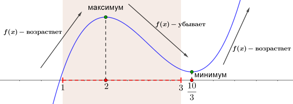 Точка максимума \(\displaystyle x=2\) попадает в промежуток \(\displaystyle \left[1;\,3\right]{\small.}\)