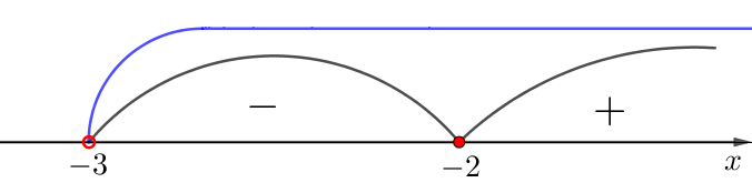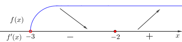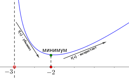 Значит, \(\displaystyle x=-2\) – точка минимума функции \(\displaystyle f(x)=3x-\ln\left(x+3\right)^3{\small.}\)