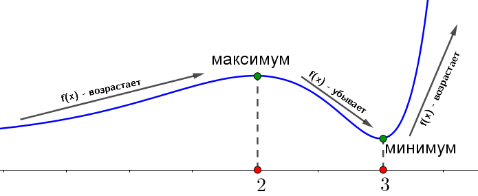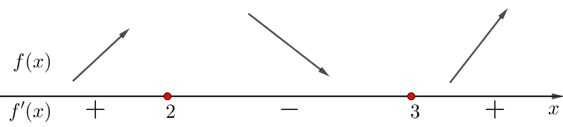 - на интервалах \(\displaystyle \color{green}{(-\infty;\,2)}\) и \(\displaystyle \color{Purple}{(3;\,+\infty)}\) функция \(\displaystyle f^{\prime}(x)>0{\small,}\)