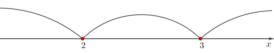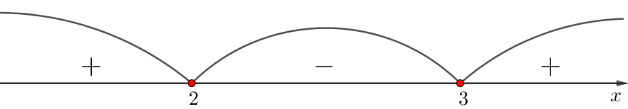 \(\displaystyle \color{green}{(-\infty;\,2)}{\small,}\) \(\displaystyle \color{blue}{(2;\, 3)}{\small,}\) \(\displaystyle \textcolor{Purple}{(3;\, +\infty)}{\small.}\)