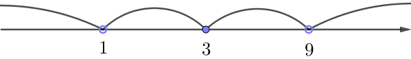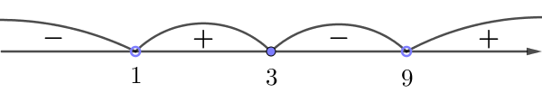 \(\displaystyle (-\infty;1){ \small ,} \, (1;3){ \small ,} \ (3;9)\) и \(\displaystyle (9;+\infty){\small .}\)