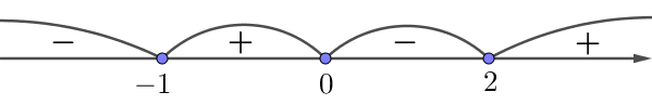 Она определена на всей числовой прямой, обращается  в ноль в точках \(\displaystyle x=0{\small ,}\) \(\displaystyle x ={-1}{\small }\) и \(\displaystyle x=2{\small.}\)