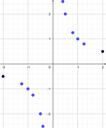 | \(\displaystyle \small y=\frac{1}{x}\) | \(\displaystyle \small -0{,}5\) | \(\displaystyle \small -0{,}8\) | \(\displaystyle \small -1\) | \(\displaystyle \small -1{,}25\) | \(\displaystyle \small -2\) | \(\displaystyle \small -2{,}5\) |