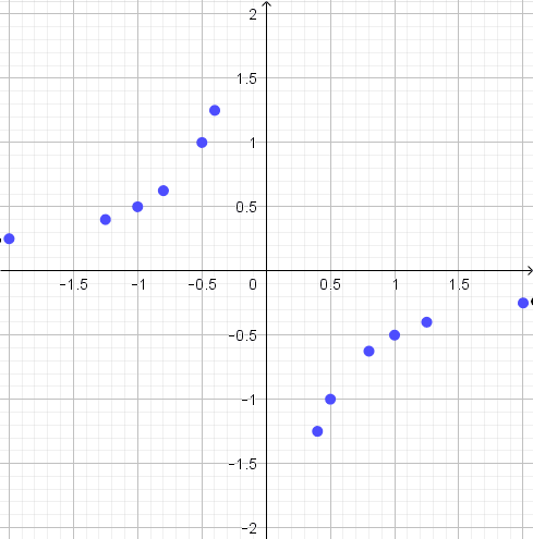| \(\displaystyle \small y=-\frac{1}{2x}\) | \(\displaystyle \small -1{,}25\) | \(\displaystyle \small -1\) | \(\displaystyle \small -0{,}625\) | \(\displaystyle \small -0{,}5\) | \(\displaystyle \small -0{,}4\) | \(\displaystyle \small -0{,}25\) |