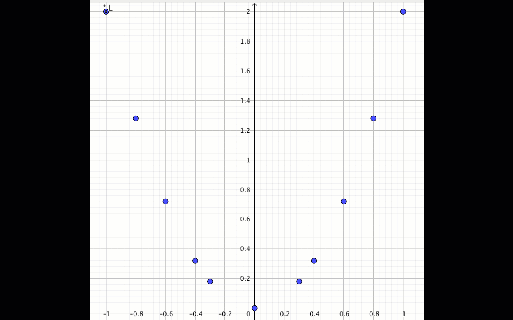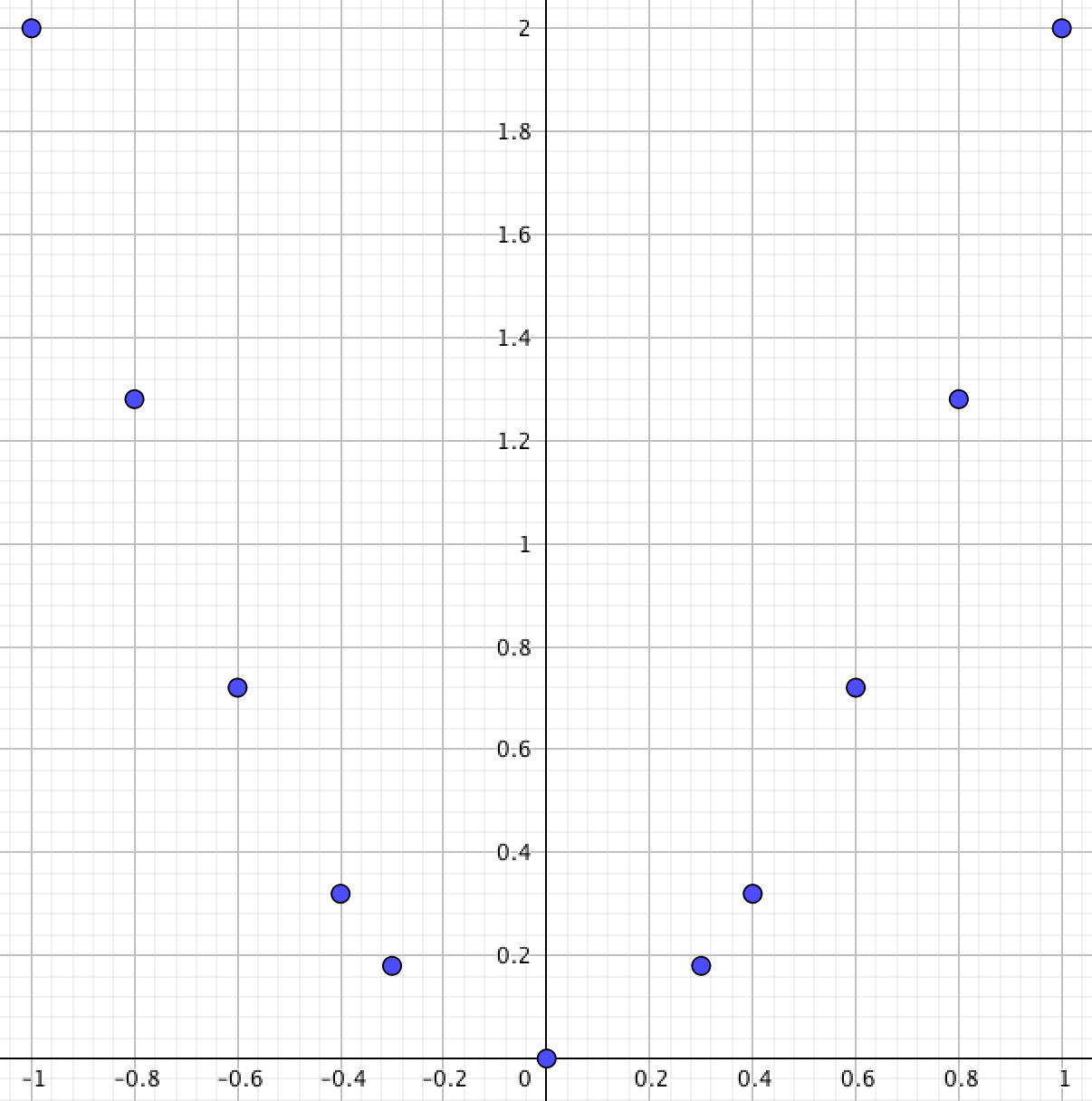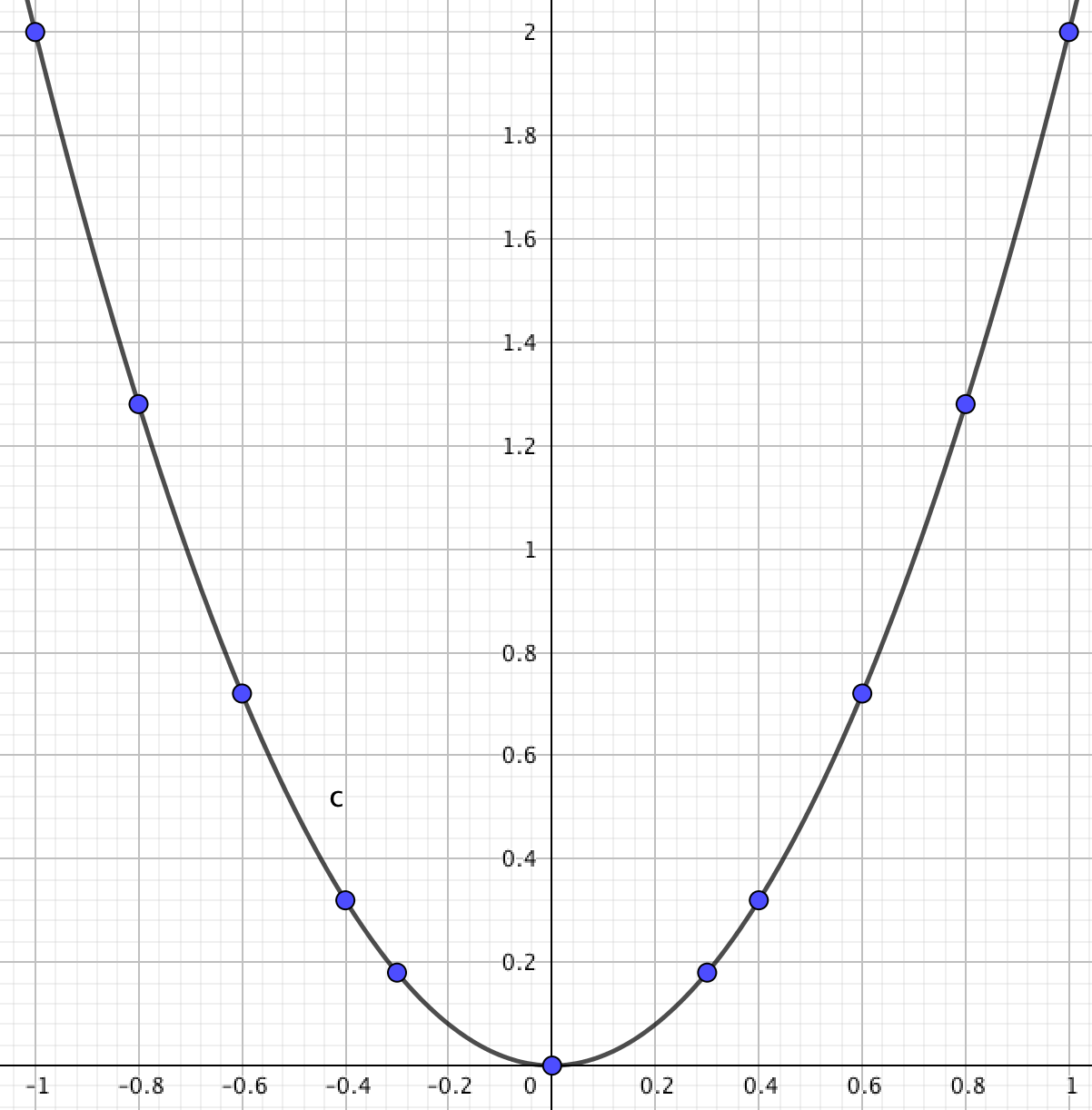 | \(\displaystyle x\) | \(\displaystyle -1\) | \(\displaystyle -0{,}8\) | \(\displaystyle -0{,}6\) | \(\displaystyle -0{,}4\) | \(\displaystyle -0{,}3\) | \(\displaystyle 0\) | \(\displaystyle 0{,}3\) | \(\displaystyle 0{,}4\) | \(\displaystyle 0{,}6\) | \(\displaystyle 0{,}8\) | \(\displaystyle 1\) |