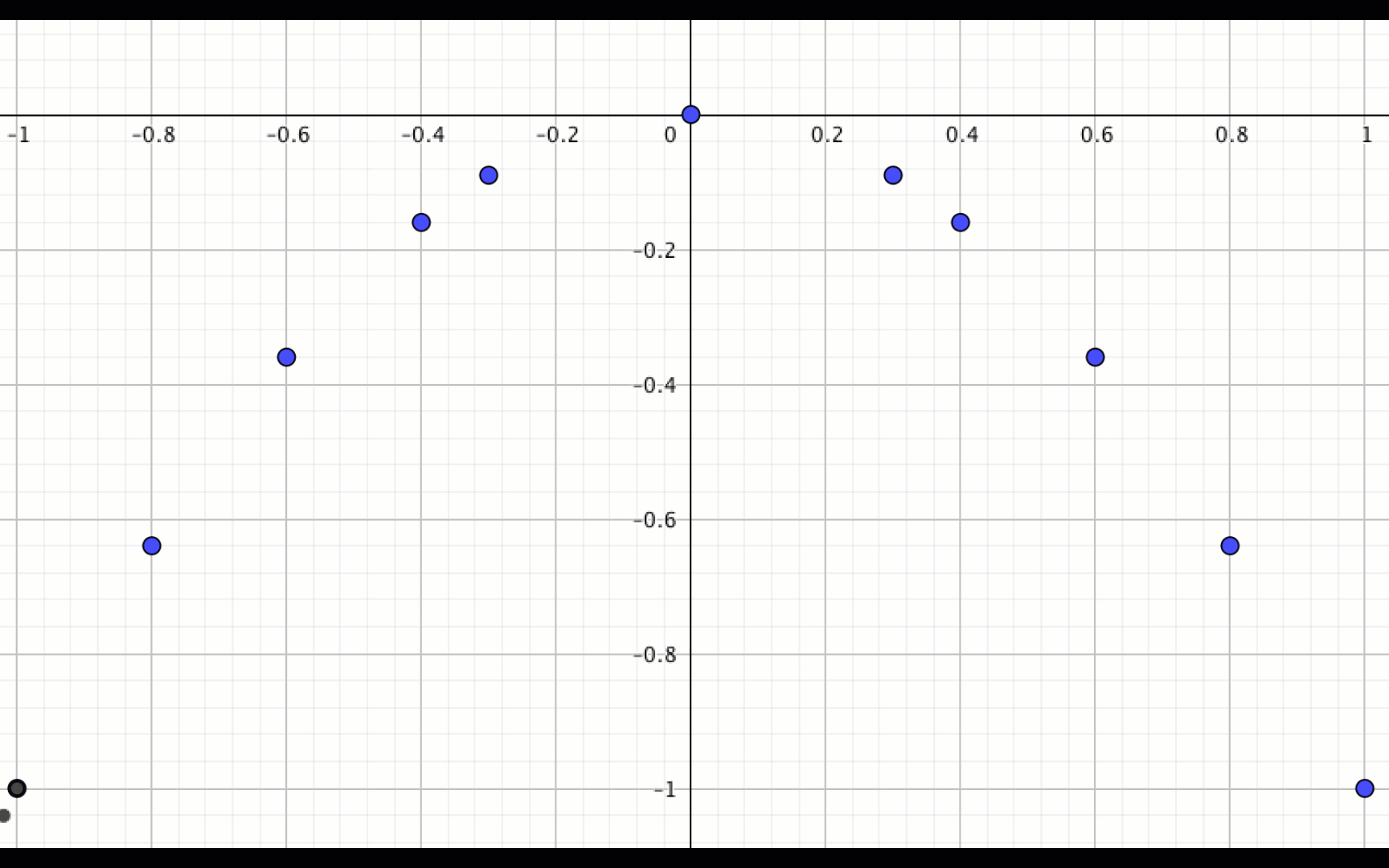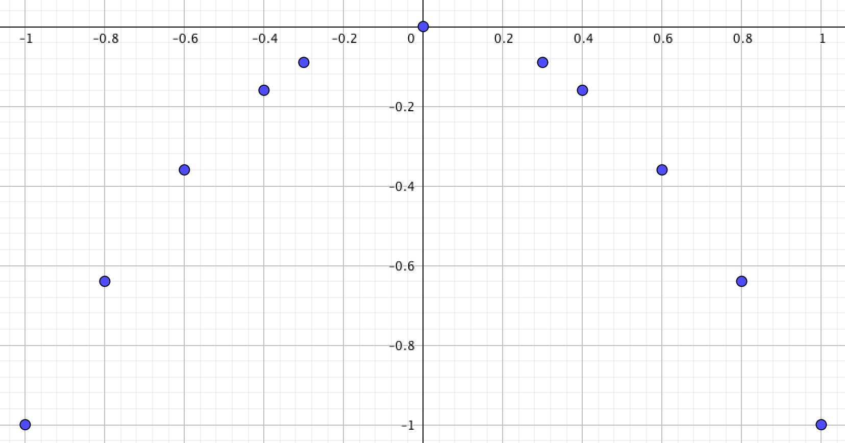 | \(\displaystyle y=x^2\) | \(\displaystyle -1\) | \(\displaystyle -0{,}64\) | \(\displaystyle -0{,}36\) | \(\displaystyle -0{,}16\) | \(\displaystyle -0{,}09\) | \(\displaystyle 0\) | \(\displaystyle -0{,}09\) | \(\displaystyle -0{,}16\) | \(\displaystyle 0{,}36\) | \(\displaystyle 0{,}64\) | \(\displaystyle 1\) |