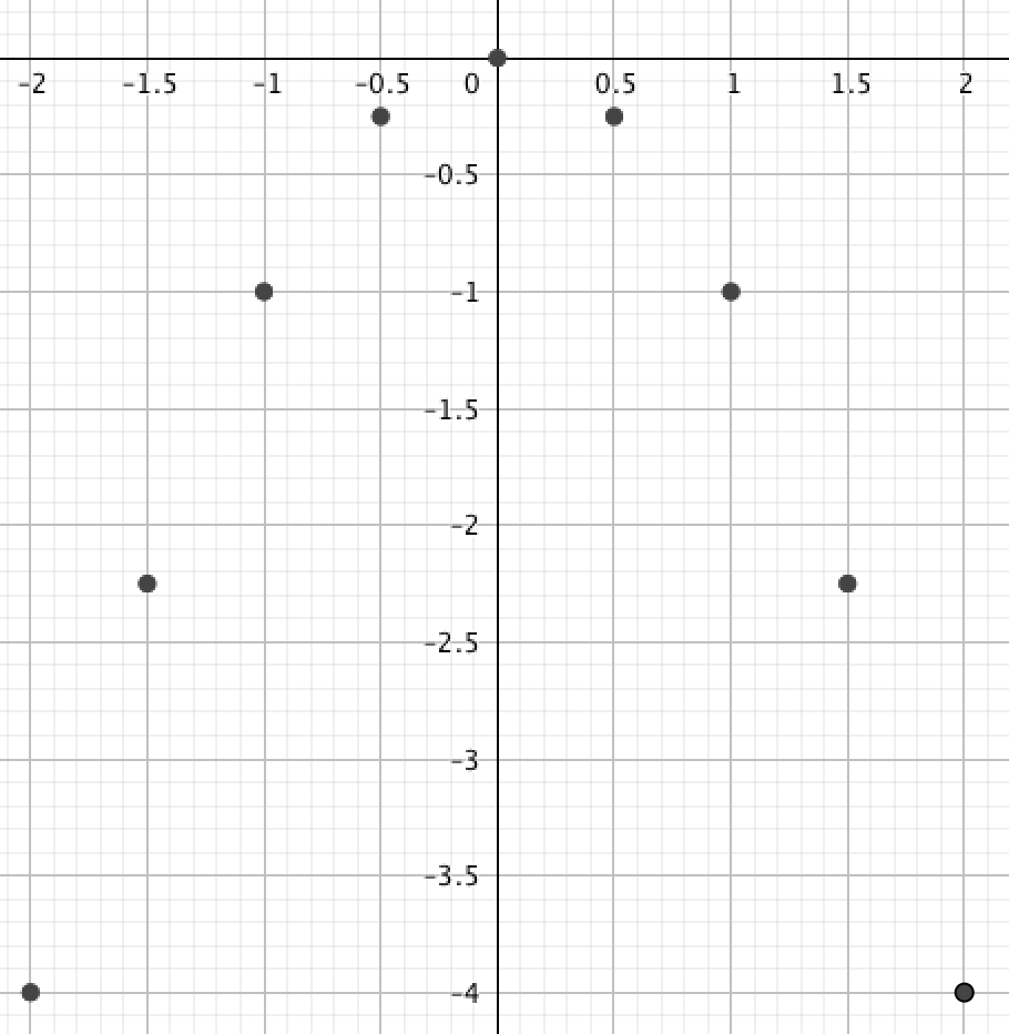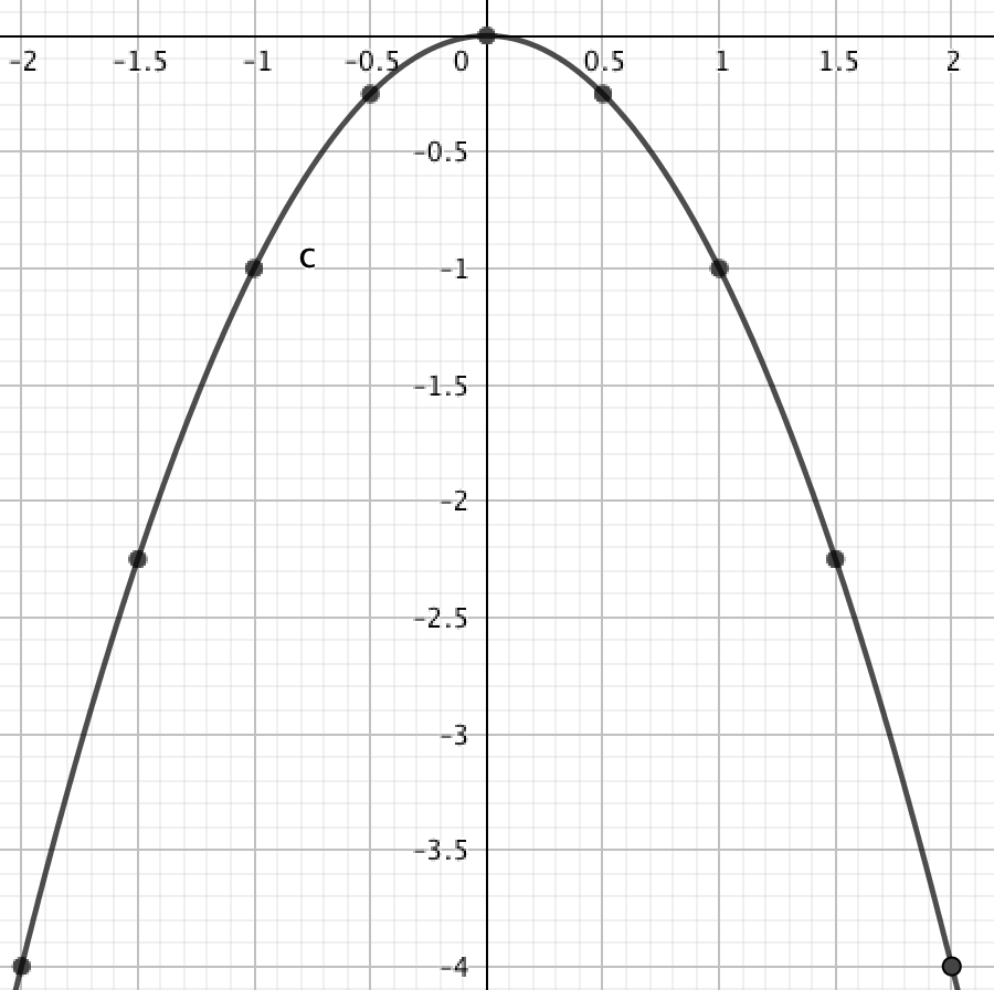 | \(\displaystyle \small y=-x^2\) | \(\displaystyle -4\) | \(\displaystyle -2{,}25\) | \(\displaystyle -1\) | \(\displaystyle -0{,}25\) | \(\displaystyle 0\) | \(\displaystyle -0{,}25\) | \(\displaystyle -1\) | \(\displaystyle -2{,}25\) | \(\displaystyle -4\) |