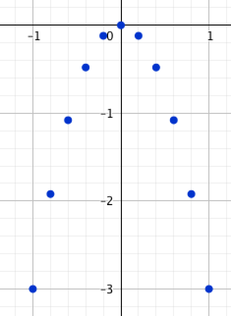 | \(\displaystyle y=-3x^2\) | \(\displaystyle -3\) | \(\displaystyle -1{,}92\) | \(\displaystyle -1{,}08\) | \(\displaystyle -0{,}48\) | \(\displaystyle -0{,}12\) | \(\displaystyle 0\) | \(\displaystyle -0{,}12\) | \(\displaystyle -0{,}48\) | \(\displaystyle -1{,}08\) | \(\displaystyle -1{,}92\) | \(\displaystyle -3\) |