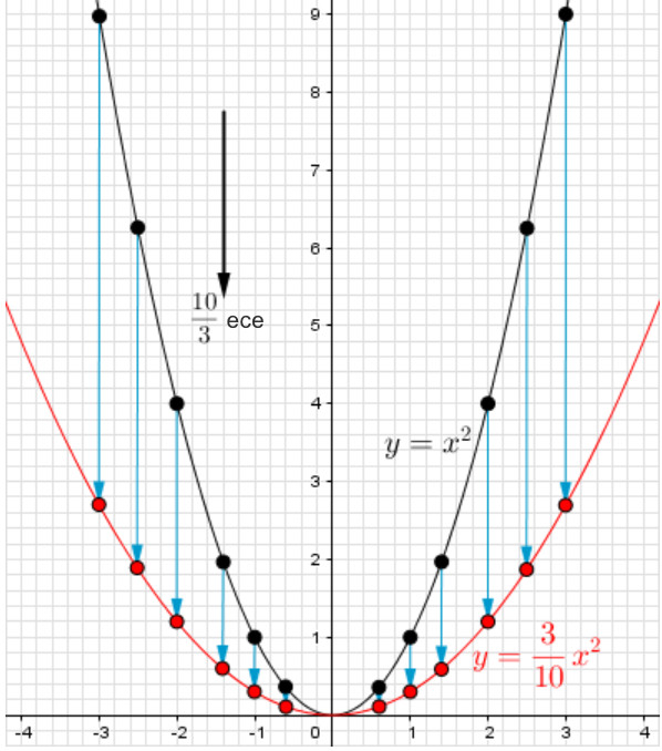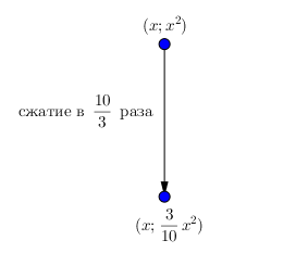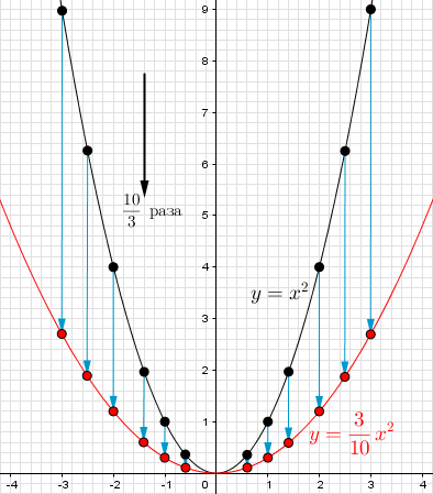 Если ординату этой точки \(\displaystyle (x;\, x^2)\) уменьшить в \(\displaystyle \color{blue}{\frac{10}{3}}\) раза, то это будет точка с координатами \(\displaystyle \left(x;\, \frac{x^2}{\color{blue}{\frac{10}{3}}}\right)=(x;\, \color{blue}{\frac{3}{10}}x^2){\small : }\)