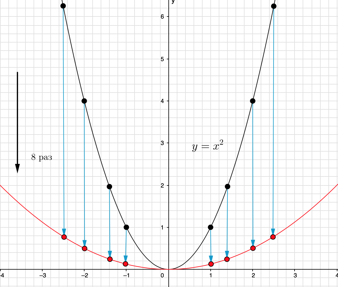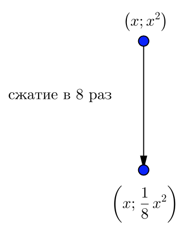 Возьмем одну точку вида \(\displaystyle (x;\, x^2)\) и сожмем ее в \(\displaystyle 8\) раз вдоль оси \(\displaystyle \rm OY{\small ,} \) то есть уменьшим значение ординаты в \(\displaystyle 8\) раз.
