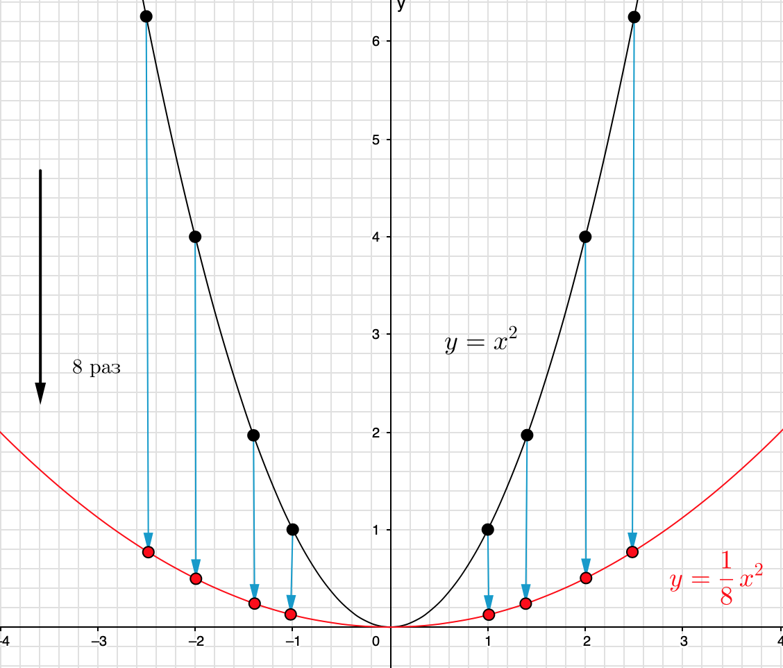 Если ординату этой точки \(\displaystyle (x;\, x^2)\) уменьшить в \(\displaystyle \color{blue}{8}\) раз, то это будет точка с координатами \(\displaystyle (x;\, \color{blue}{\frac{1}{8}} \cdot x^2){\small : }\)