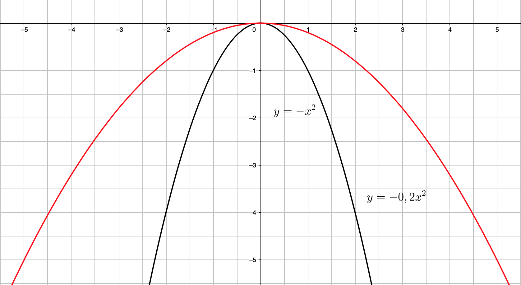 Сравним, как изменилась координата \(\displaystyle y \) для парабол \(\displaystyle y=\color{blue}{-x^2} \) и \(\displaystyle y=\color{red}{-0{,}2x^2}{\small :} \)