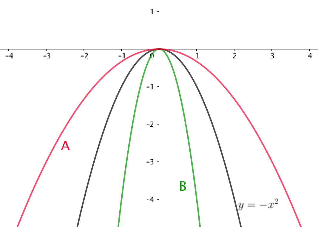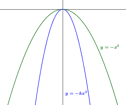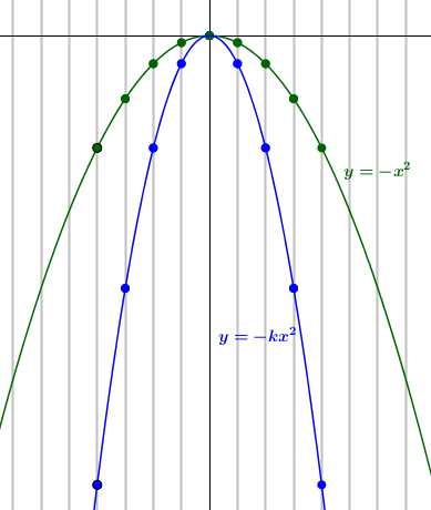 Если \(\displaystyle \color{blue}{ k}>1{ \small ,}\) то для ненулевого \(\displaystyle x_0\) точка с координатами \(\displaystyle \color{blue}{ (x_0;\,-kx_0^2)} \) лежит ниже точки с координатами \(\displaystyle \color{green}{ (x_0; -x_0^2)}{ \small ,} \) так как \(\displaystyle \color{blue}{ -kx_0^2}<\color{green}{ -x_0^2}{\small .}\)