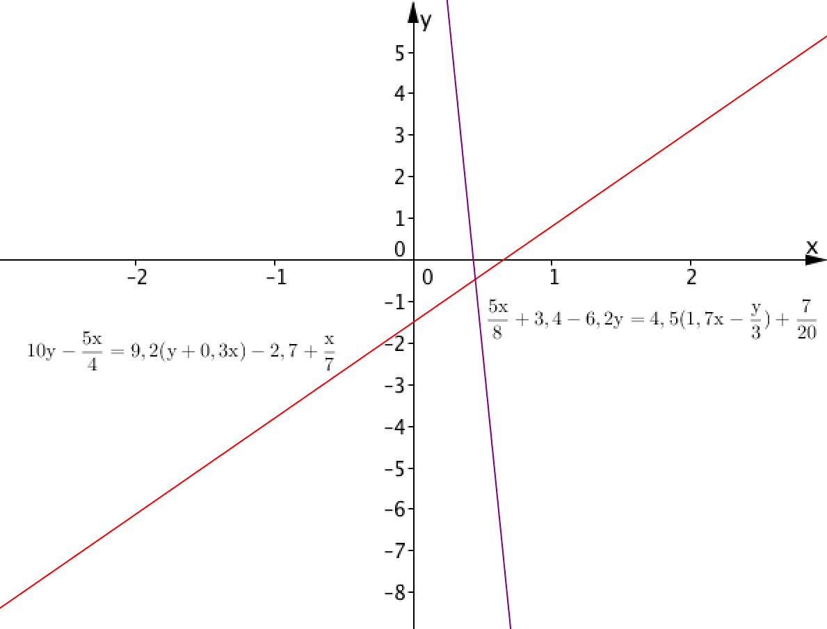 \(\displaystyle \begin{array}{rl} \left\{ \vphantom{\begin{aligned} 1\\ {\small \frac{2}{3}} \end{aligned}} \right.&\kern{-1.5em} \begin{aligned} &10y-{\small \frac{5x}{4}}=9{,}2(\,y+0{,}3x\,)-2{,}7+{\small \frac{x}{7}}{\small , }\\ &{\small \frac{5x}{8}}+3{,}4-6{,}2y=4{,}5(1{,}7x-{\small \frac{y}{3}})+{\small \frac{7}{20}}{\small . } \end{aligned} \end{array}\)