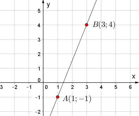 \(\displaystyle A(1;\, -1)\) және \(\displaystyle B(3;\, 4)\,{\small }\)нүктелері арқылы өтетін түзу теңдеуді табыңыз: