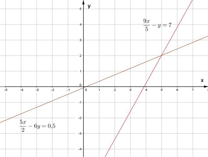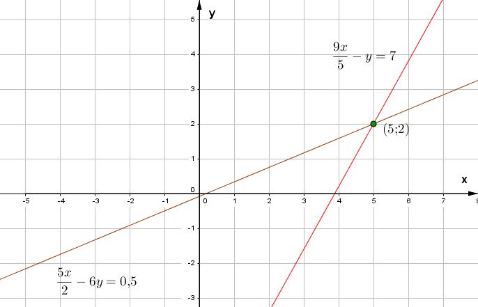 является точка с координатами \(\displaystyle (x_0;\, y_0){\small ,}\) которая одновременно лежит на прямых \(\displaystyle \frac{9x}{5}-y=7\) и \(\displaystyle \frac{5x}{2}-6y=0{,}5{\small . }\) Значит, это точка пересечения данных прямых, а ее координаты и являются решением.