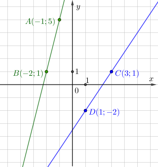 Прямая проходит через точки \(\displaystyle \color{blue}C(\color{blue}{3};\color{blue}{1})\) и \(\displaystyle \color{blue}D(\color{blue}{1};\color{blue}{-2}){ \small .}\)