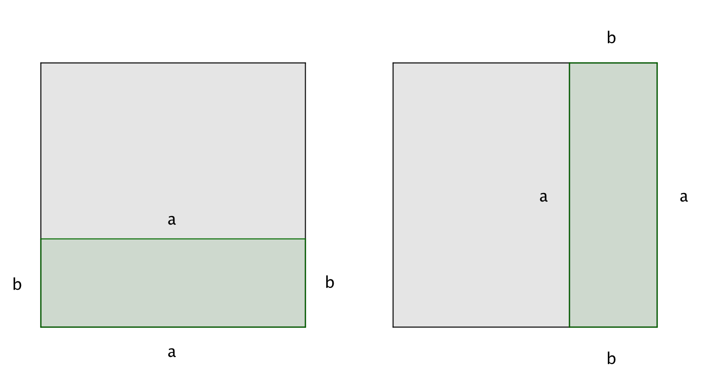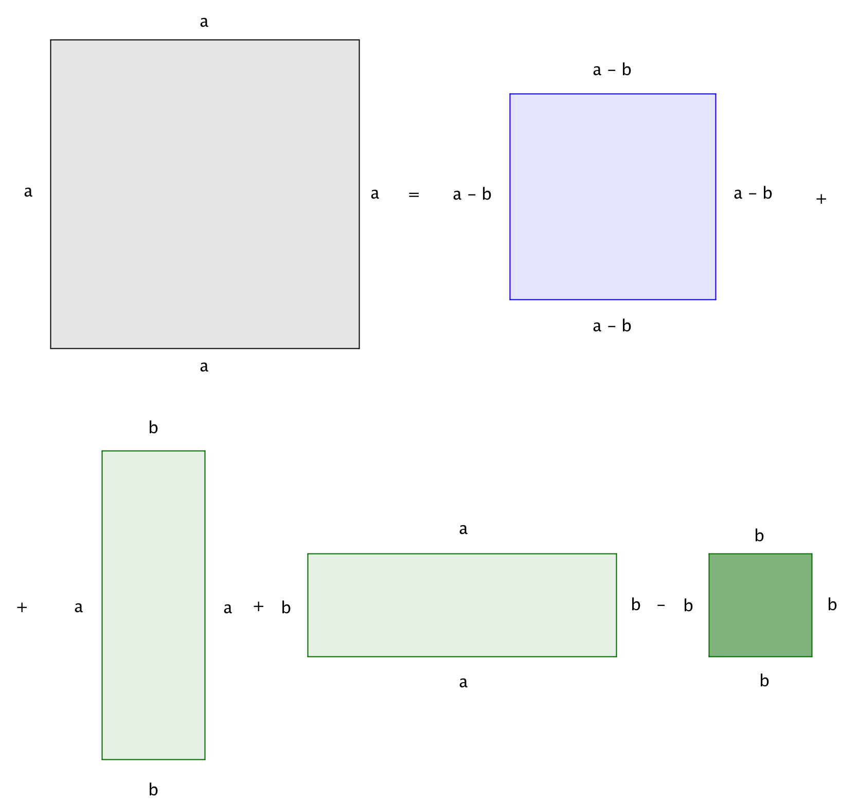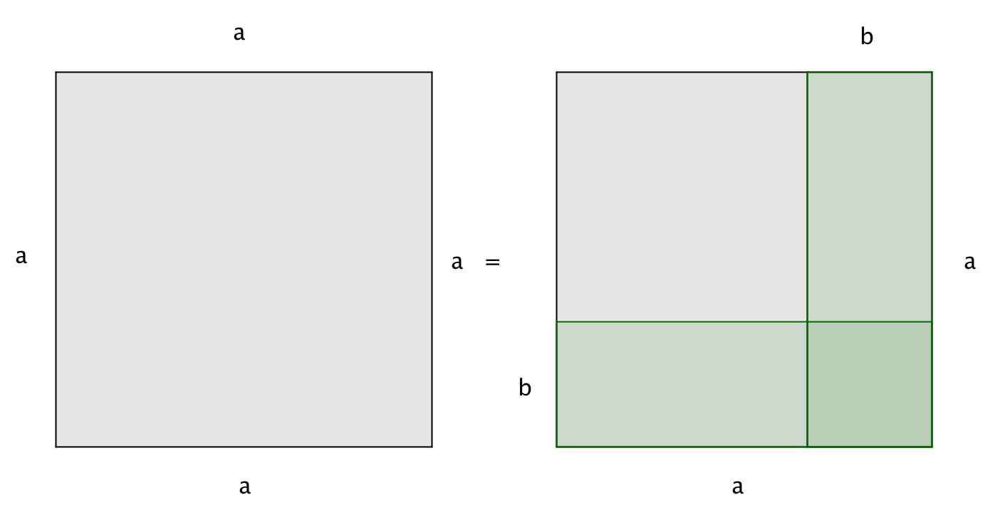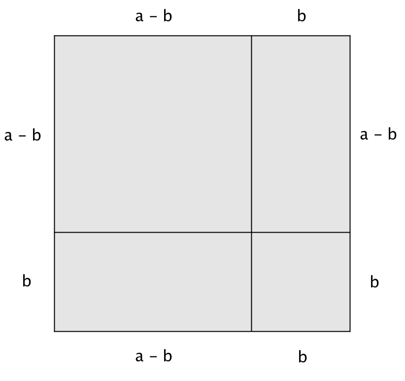 Поэтому площадь квадрата со стороной \(\displaystyle a\) равна сумме площадей квадрата со стороной \(\displaystyle a-b\), двух прямоугольников со сторонами \(\displaystyle a\) и \(\displaystyle b\) за вычетом площади квадрата со стороной \(\displaystyle b.\)
