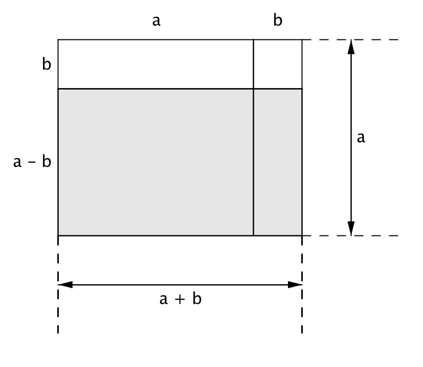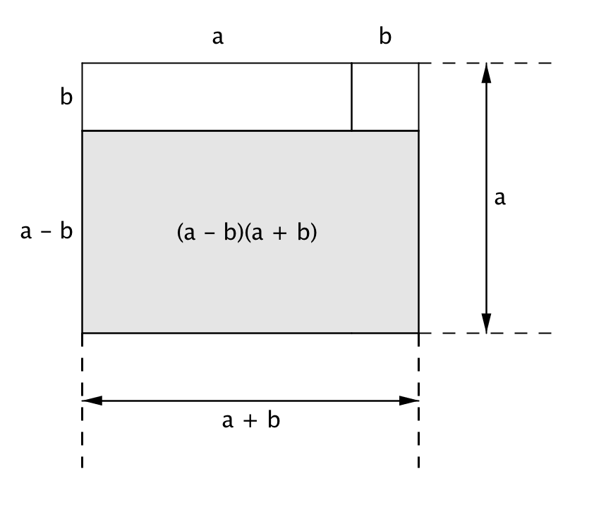 Площадь этого прямоугольника (закрашенного серым цветом) равна произведению длин его сторон, то есть \(\displaystyle (a-b\,)(a+b\,):\)