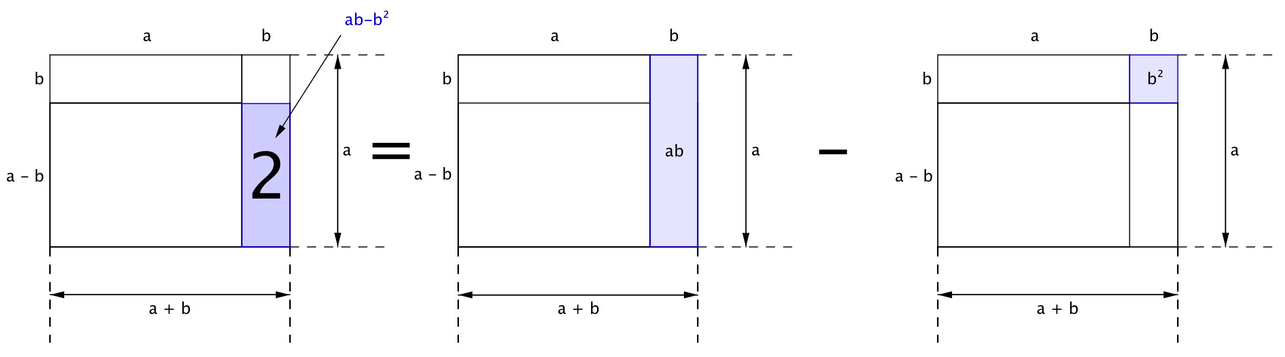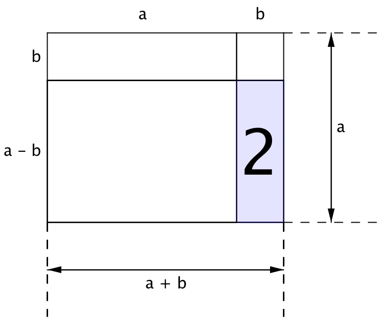 Площадь прямоугольника "2" равна разности площадей прямоугольника со сторонами \(\displaystyle a\) и \(\displaystyle b\) и квадрата со стороной \(\displaystyle b:\)