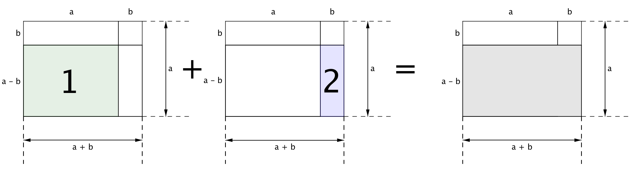 Таким образом, площадь прямоугольника со сторонами \(\displaystyle (a-b\,)\) и \(\displaystyle (a+b\,)\) равна сумме площадей прямоугольников "1" и"2":
