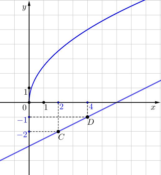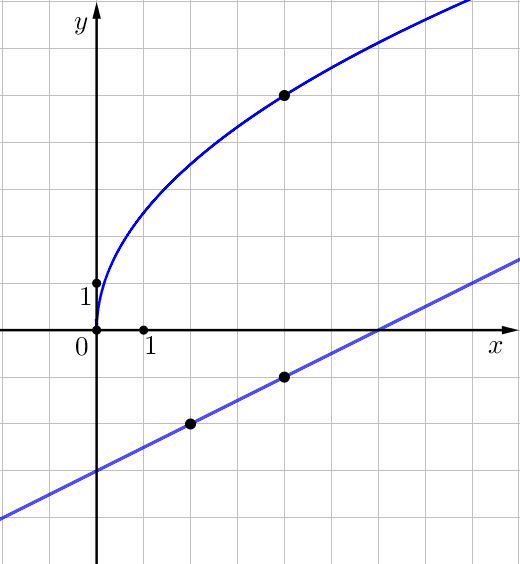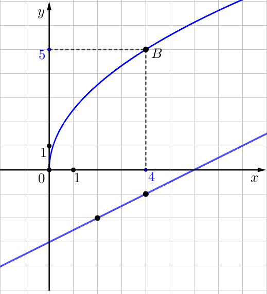 Точка \(\displaystyle A\) – это точка пересечения графиков функций \(\displaystyle f\left(x\right)=2{,}5\sqrt{x}\) и \(\displaystyle g\left(x\right)=0{,}5x-3{\small . }\) Значит, её координаты удовлетворяют уравнениям обеих функций: