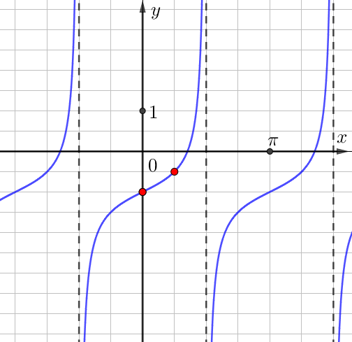 Поскольку \(\displaystyle \tg \color{blue}{0}=0\) и \(\displaystyle \tg\color{green}{\frac{\pi}{4}}=1{ \small ,}\) то