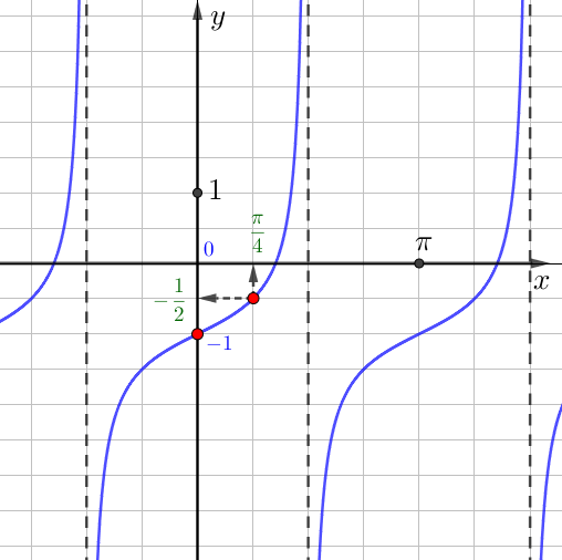 \(\displaystyle \left\{\begin{aligned}\color{blue}{-1}&=a\cdot \tg \color{blue}{0}+b{ \small ,}\\\color{green}{-\frac{1}{2}}&=a\cdot \tg\color{green}{\frac{\pi}{4}}+b{ \small .}\end{aligned}\right. \)
