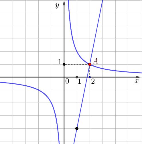 Точки \(\displaystyle A\) и \(\displaystyle B\) – это точки пересечения графиков функций \(\displaystyle f\left(x\right)=\frac{2}{x}\) и \(\displaystyle g\left(x\right)=5x-9.\) Значит, координаты этих точек удовлетворяют и уравнению гиперболы, и уравнению прямой