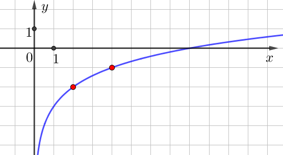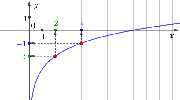 Заметим, что на графике функции \(\displaystyle f(x)=b+\log _{a} x\) отмечены точки с координатами \(\displaystyle (\color{blue}4;\color{blue}{-1})\) и \(\displaystyle (\color{green}2;\color{green}{-2}){ \small .}\)