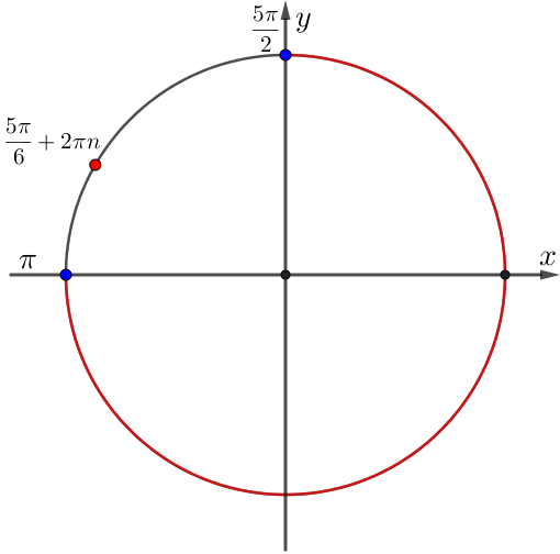 \(\displaystyle \pi\leqslant \frac{5\pi}{6}+2\pi n \leqslant \frac{5\pi}{2}{ \small .}\)